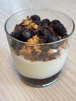 Yogur natural, mermelada de arándanos, crunch, arándanos y virutas de chocolate.